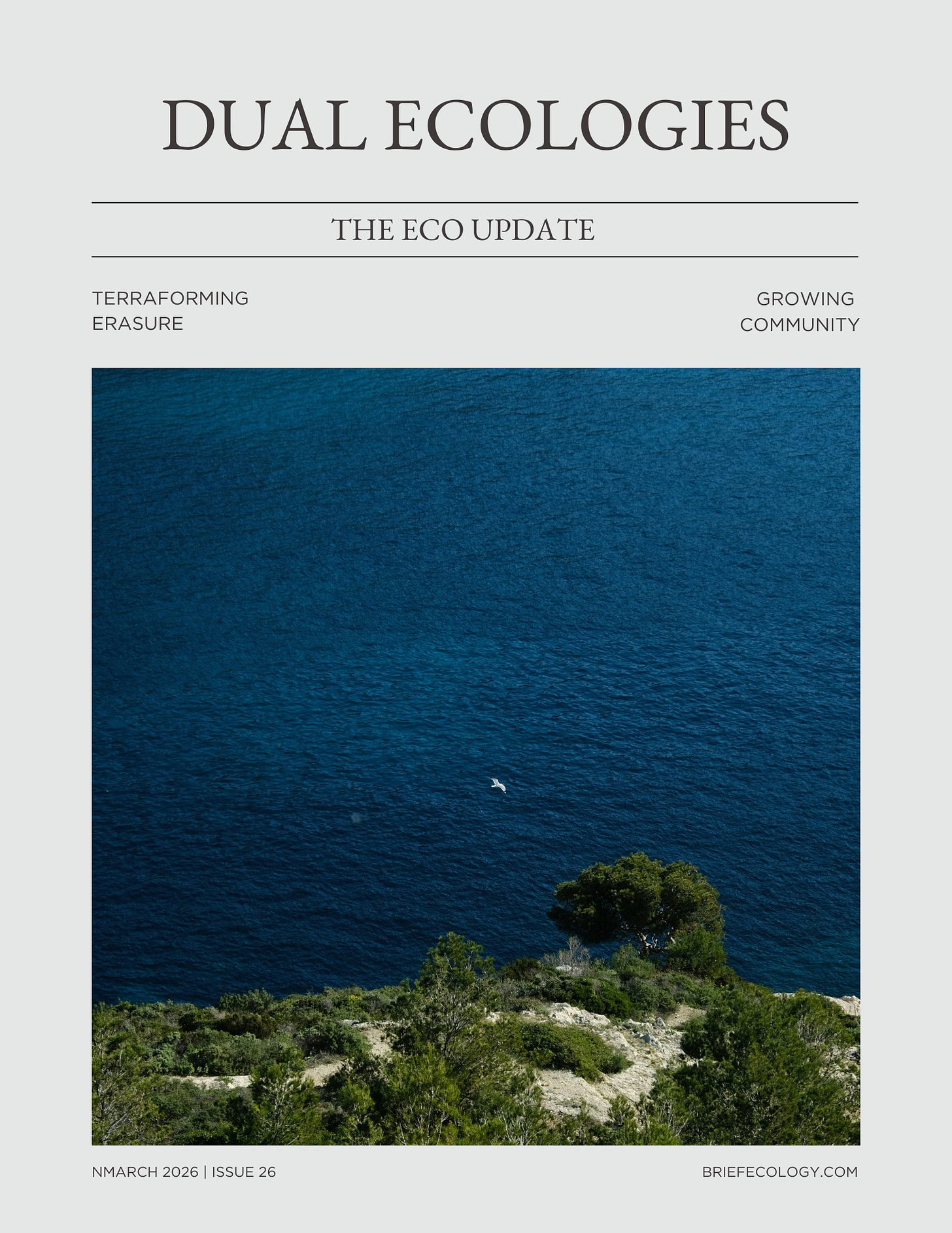 Nature does not exist in dualities, but our ideas often do. Ecofascism or Ecosocialism, profit or the planet, fixing Earth or leaving it behind, land or sea, human or nonhuman. The pages of this month’s issue of The Eco Update explores all of these binaries, as well as the spaces between them.